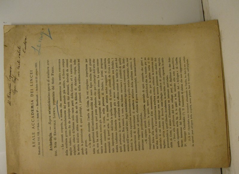 In 8, pp. 599-603 con foto in b/n n.t. Dedica autogr. dell'A. alla prima p. Intonso. Br. rifatta. Estratto dai Rendiconti della Reale Accademia dei Lincei. Studio di una scultura cretese ritrovata sull'acropoli di Eleutherna e custodita nel Museo Syllogos.