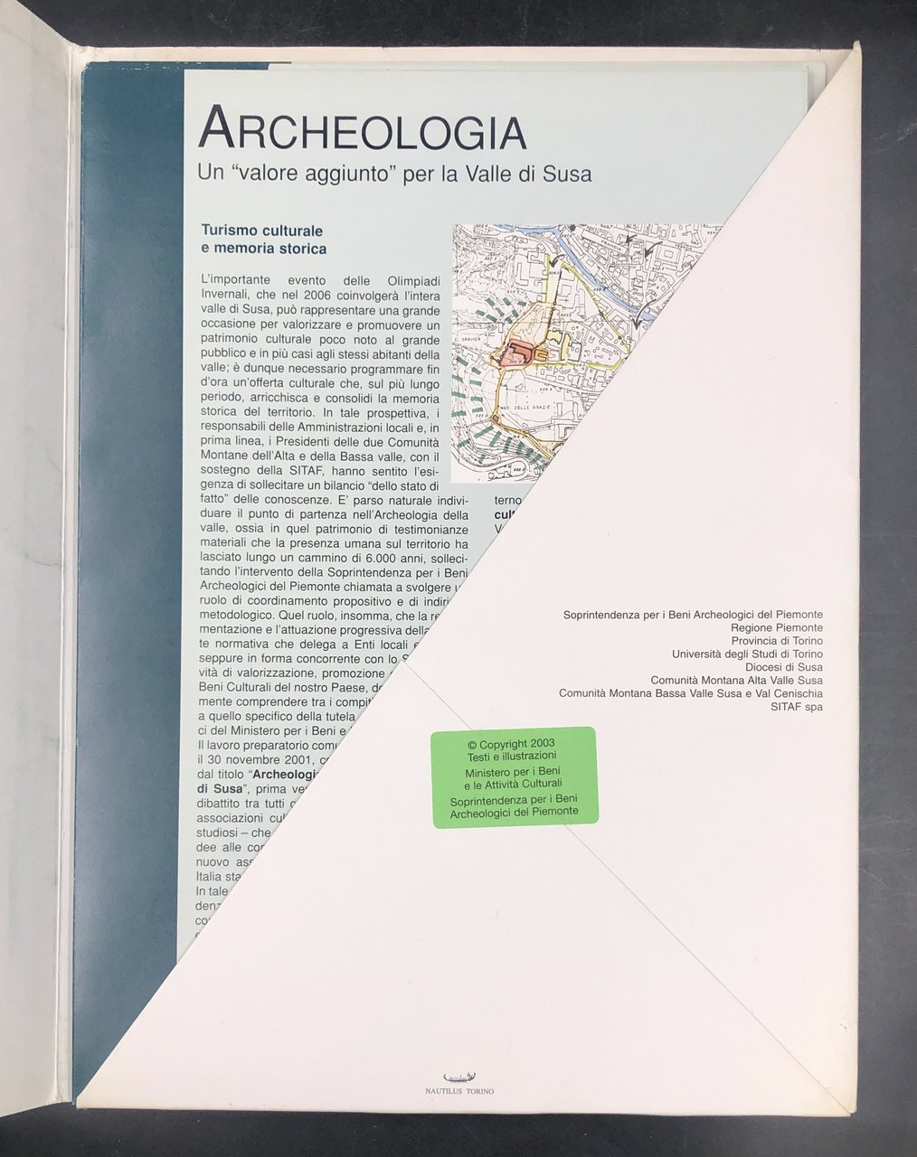 Caretella editoriale in cartoncino, cm. 31x22,6 contenente un doppio foglio di presentazione di 4 facciate a stampa ill., una scheda generale e 17 schede in cartoncino impresse solo recto, sciolte, illustrate a colori con CARTINE e belle VEDUTE a COLORI ecc. Chianocco e Mompantero; Vaie e Borgone, Novalesa e Rocciamelone, Certose di Villarfocchiardo, Chiomonte e La maddalena, Palafitte di Trana e Avigliana, Castello di Susa, Tempio romano e prioarato S. Saturnino presso Susa, Strada Romana alla Perosa di Rivoli, Case rurali roamne al fiume a Rosta, Almese, Villa rustica a caselette, Tour d'Amount a Bardonecchia, Abbazia della Novalesa, Frontiera fortificata delle Chiuse tra Abbazia San Michele e castello di Caprie, ville e villaggi romani tra Rivoli e Avigliana. Con sorprese anche per chi pratica la valle da anni.