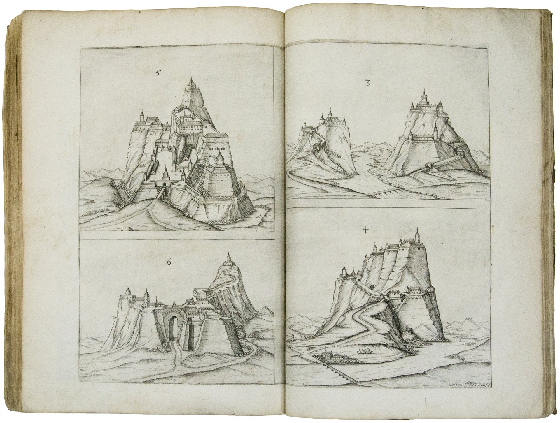 In folio. Cc. [8], 112 [i.e. 114, ossia 1-66, (1), 66-112], [1: errata]. Titolo stampato in rosso e nero entro una bella cornice architettonica incisa in rame da Matthias Greuter, armi xilografiche di Julius Duca di Brunswig, 21 tavole calcografiche fuori testo (di cui 1 a piena pagina e 20 su doppia pagina, alcune delle quali tuttavia appaiono come fogli singoli; una di esse è inoltre firmata da Matthias Greuter) e numerose figure in legno nel testo. Pergamena floscia coeva con al centro dei piatti, aggiunto posteriormente, il supralibros della Royal Engineers Library (un po' sporca di fuliggine). Ottima copia marginosa proveniente dalla bibliteca di Walter Hawken Tregellas (1831-1894), scrittore, storico e disegnatore inglese, e dalla Royal Engineers Library (di cui, oltre ai supralibros, sono presenti anche alcuni timbri all'interno del volume).