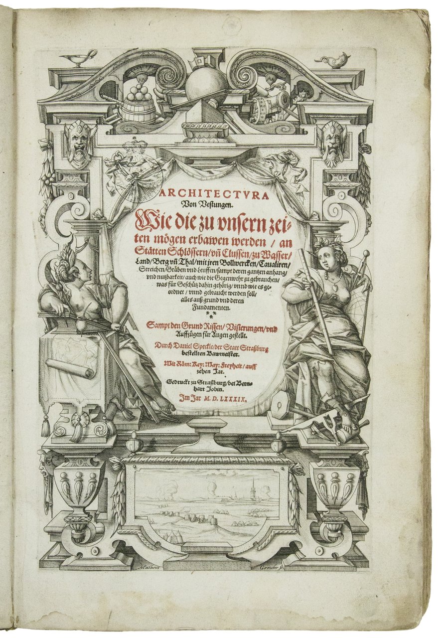 RARA PRIMA EDIZIONE di questa magnifica opera di fortificazione ed urbanistica, che rappresenta il più importante contributo di area tedesca in materia dopo la Etliche Underricht zur Befestigung der Stett (1527) di Dürer. Essa divenne ben presto il testo di riferimento per la costruzione delle fortezze a nord delle Alpi e lo rimase molto a lungo, fin tanto che non cambiarono le tecniche di guerra e di assedio. Il trattato fu ristampato nel 1599, 1608, 1705 e ancora nel 1756."Speckle writes his treatise from a strongly national motivation as is clear from his preface. He wishes to prove that the Germans are not completely without imagination, and that their invention of printing and of a 'grausam Geschütz' ('fearsome artillery') shows them to be the 'the greatest in the world' in these fields. He attacks, above all, the Italian theorists for their academic disputes, declaring their rules to be outmoded and openly ridiculing their approach ('when someone has no Latin, he cannot understand it, and so has no business to talk about it'). He demonstrates the urgency of fortification, as Dürer has done, by reference to the Turkish threat. Speckle claims to be familiar with fifty or sixty types of fortification, but restricts himself to a few only. He writes in German and avoids foreign words, 'so that every German - such as I too have the honour to call myself - can understand"' (H.-W. Kruft, A History of Architectural Theory from Vitruvius to the Present, London-New York, 1994, p. 115).Oltre a Dürer, Speckle trasse anche ispirazione dall'opera di Francesco de Marchi, Della architettura militare. Egli fu tuttavia soprattutto un uomo pratico, in cui matematica e geometria si univano ad una conoscenza della meccanica e della tecnica maturata sul campo. Alcune delle fortezze e dei castelli riprodotti nel libro appaiono come costruzioni fantastiche frutto della fantasia immaginifica dell'autore. La copia dell'edizione del 1608 conservata a Strasburgo ha tuttavia dimostrato che si tratta in realtà di costruzioni realmente esistite, in quanto viene specificato il nome di ciascun castello effigiato. Nella seconda parte del trattato Speckle si sofferma poi su come differenziare i progetti a seconda del tipo di terreno su cui si va ad edificare. Descrive infine l'assedio turco di Malta (1565) e la ricostruzione de La Valetta, fornendoci importanti particolari circa il progetto di Francesco Laparelli (cfr. J. Zimmer, Daniel Speckle Architectura Von Vestungen, in: "Architectural Theory from the Renaissance to the Present", a cura di B. Evers e C. Thoenes, Köln, 2003, pp. 511-519).I 28 capitoli della prima parte sono dedicati alla progettazione urbanistica ed in essi Speckle descrive in dettaglio un progetto di città ideale con otto bastioni, dietro al quale traspaiono anche le sue idee politiche e sociali. Di classica forma radiale, il piano prevede una piazza centrale, sede del potere religioso, secolare ed economico, in cui trovano posto la chiesa, il palazzo reale, il municipio e il mercato. Il potere militare viene invece confinato sui bastioni; Speckle pone infatti espressamente la legge civil