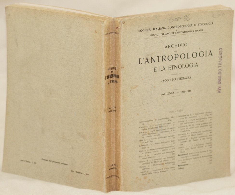 ARCHIVIO PER L'ANTROPOLOGIA E LA ETNOLOGIA FONDATO DA PAOLO MANTEGAZZA VOLUME LX LXI 1930-1931