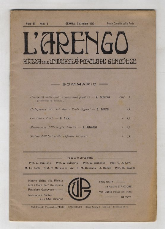 ARENGO (L'). Rivista mensile dell'Università Popolare Genovese. Anno III, num. 5, settembre 1913.