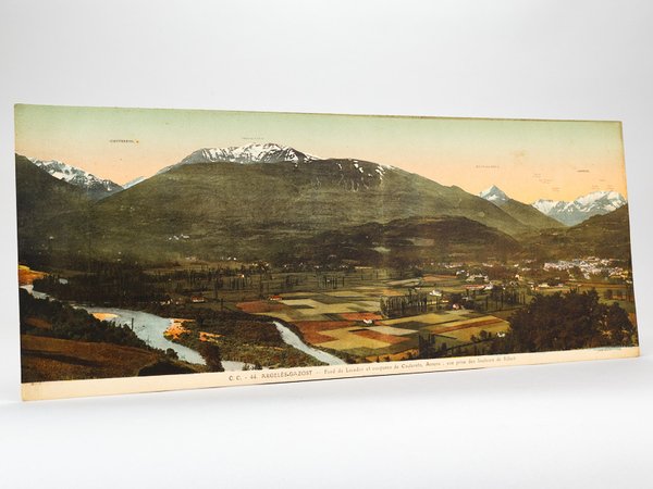 Carte panoramique géante en couleurs, format 56 x 22,5 cm, Carrache éditeur, cliché Rayssé, Pau, s.d. (vers 1910) Belle vue panoramique originale en couleurs, en très bon état. Rare vue grand format, éditée par Célestin Carrache, actif à Pau au début du XXe siècle.