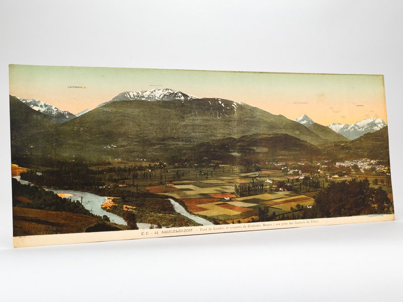 Argelès-Gazost. Fond du Lavedan et coupures de Cauterets, Arrens ; vue prise des hauteurs de Silhen (C.C. 44) [ Vue panoramique géante en couleurs format 56 x 22,5 cm ]