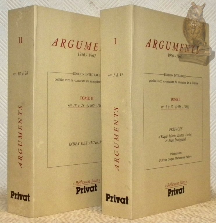 Arguments 1956 - 1962. Edition intégrale publiée avec le concours du monistère de la Culture. Tome I, nos. 1 à 17 (1956 - 1960). Préfaces d’Edgar Morin, Kostas Axelos et Jean Duvignaud. Présentations d’Olivier Corpet, Mariateresa Padova. Tome II, nos. 18 à 28 (1960 - 1962). Index des Auteurs. Collection Réflexion faite.
