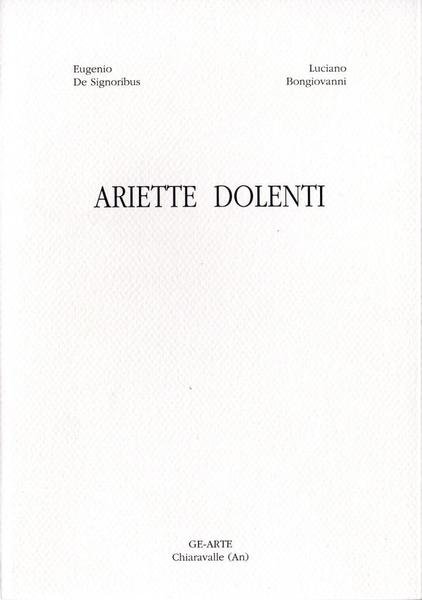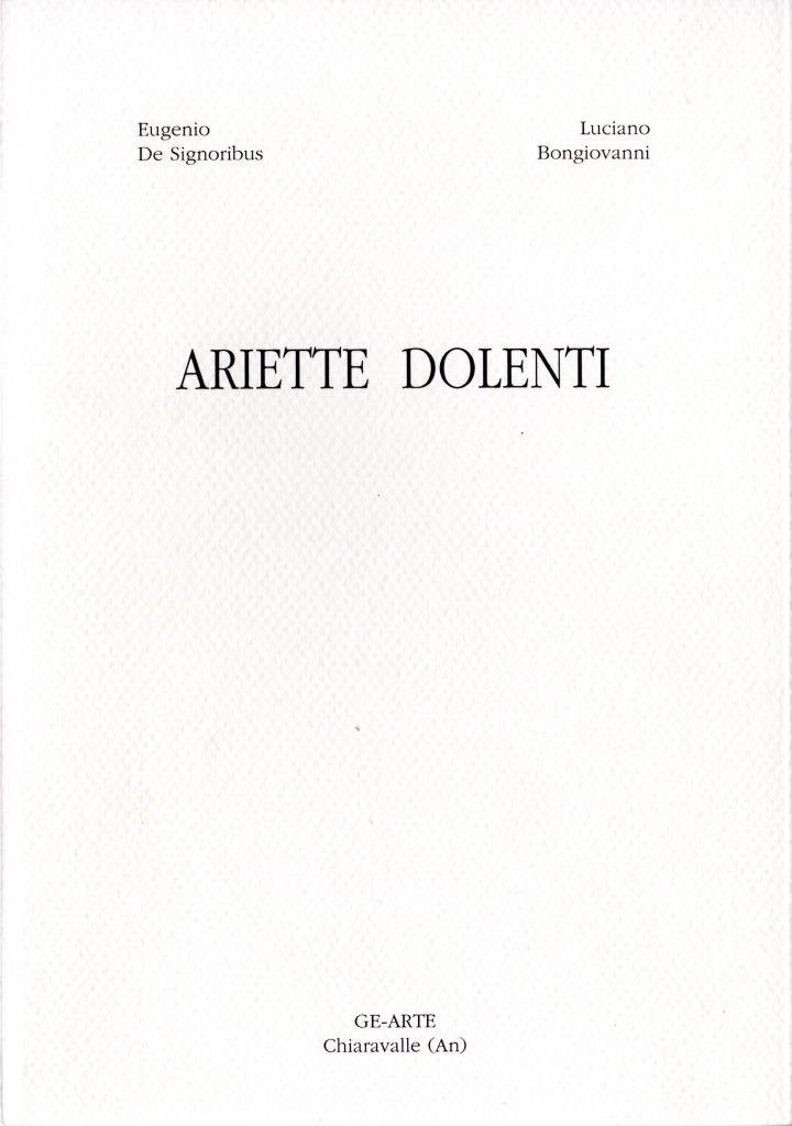 Ariette dolenti, prima edizione agosto 1997, formato 18 x 25.<BR>Copertina morbida di colore bianco con titoli in nero al piatto anteriore. Questa edizione contiene tre ariette inedite di Eugenio di Signoribus e tre acqueforti di Luciano Bongiovanni tirate a mano dall'autore con un torchio a stella. Tiratura limitata in 40 esemplari, dall'1/30 al 30/30 in numeri arabi e dal I/X al X/X in numeri romani. Edizione stampata su carta Rosaspina di Fabriano. <BR>Ottime condizioni.