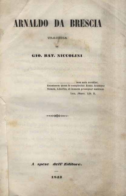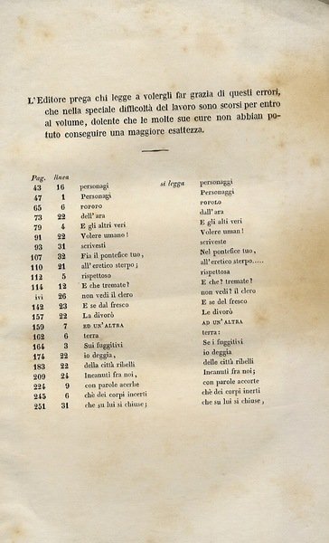 [S.l.], a spese dell'Editore [Felice Le Monnier], 1843. Al verso del frontespizio: Marsiglia, Tipografia degli Eredi Feissat maggiore e Demonchy, in-16, br. editoriale (ma mancante della copertina anteriore e di buona parte del dorso) pp. [4], 408, [2]. Prima edizione. Parenti, p. 366. “Index Librorum Prohibitorum”: Decr. 15 Gennaio 1844.