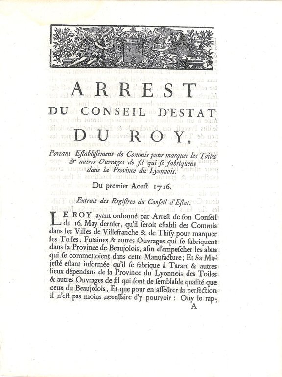 ARREST du Conseil d'Estat du Roy portant Establissement de Commis pour marquer les Toiles et autres Ouvrages de fil qui se fabriquent dans la Province du Lyonnois.