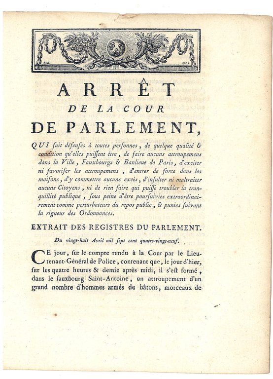 Arrêt de la Cour de Parlement, qui fait défense à toutes personnes, de quelque qualité et condition qu'elles puissent être, de faire aucuns attroupemens dans la Ville, fauxbourgs et Banlieu de Paris, d'exciter ni favoriser les atroupements, d'entrer de force dans les maisons, d'y comettre aucuns excès, d'insulter ni maltraiter aucuns Citoyes, ni de faire qui puisse troubler la tranquilité publique, sous peine d'Etre poursuivies extraordinairement comme perturbateurs du repos public, et punies suivant la rigueur des Ordonnances.