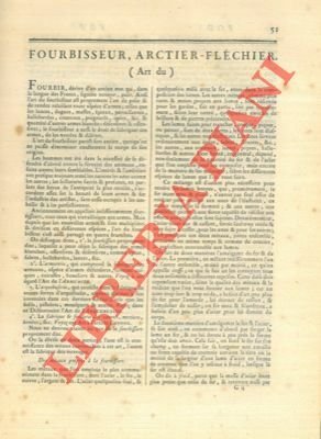 Paris, (1784) pp. 51/63 con quattro tavole (tre di cm. 21 x 27 ed una 42 x 27) incise in rame raffiguranti laboratori, artigiani utensili vari e prodotti finiti (pugnali, frecce, alabarde).