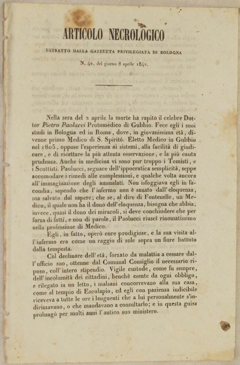 In 8. Dim. 19,5x13 cm. Pp. (2). Rara pubblicazione, l'articolo necrologico del 1842 sulla morte del Dottor Pietro Paolucci protomedico di Gubbio scritto da Domenico Petrini. Estratto dalla Gazzetta privilegiata di Bologna n. 42 del 8 aprile 1842. In discrete condizioni Copertina assente. Legatura assente. Pagine in discrete condizioni con fioriture, macchie e usure marginali.Scarce pamphlet, the article of 1842 about the death of Dottor Pietro Paolucci protomedico from Gubbio written by Domenico Petrini. Extract from Gazzetta privilegiata di Bologna n. 42 of the 8th of april 1842. In fair conditions. Cover is missing. Binding is missing. Inside pages are in fair conditions with foxings, stains and wearings in the edges.