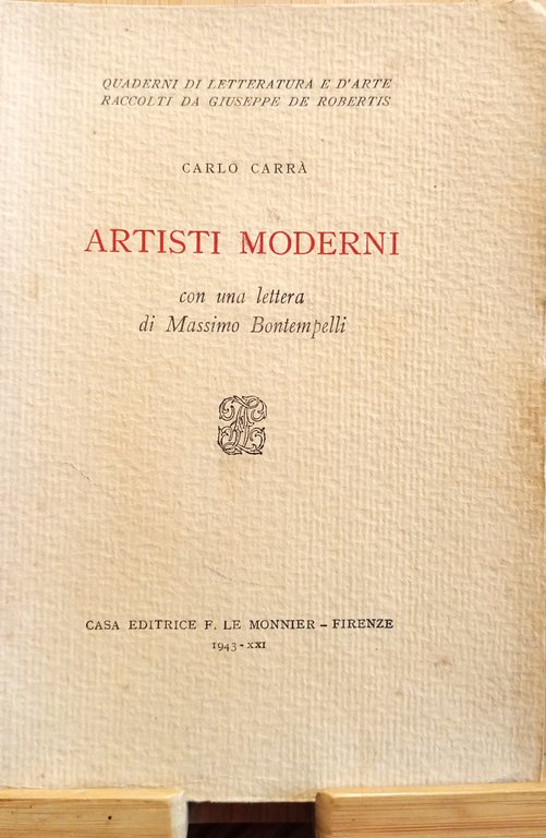 I ed. con tiratura limitata: "L'edizione originale di questo quaderno si compone di mille esemplari numerati da 1 a 1000. Abbiamo stampato 150 esemplari fuori commercio riservati al servizio stampa. Esemplare N. 432" (p. IV). Collezione "Quaderni di Letteratura ed'Arte" raccolti da Giuseppe De Robertis, vol. 7. In-8 piccolo, pp. VIII+116, bross. Stato buono (copertina ingiallita e con qualche piccola fioritura - pagine ingiallite) Indice: lettera di Massimo Bontempelli a Carlo Carrà - I Pittori (Piccio (Giovanni Carnovali) - Honoré Daumier - Antonio Fontanesi - silvestro Lega - Giovanni Fattori - Jan Evangelista/ Johannes Evangelista Purkynè/ Purkyn?/ Purkinje - Paul Cézanne - Claude Monet - Daniele Ranzoni - Paul Gauguin - Francesco Paolo Michetti - Mario De Maria (Marius Pictor) - Gaetano Previati - Giovanni Segantini - Giuseppe Pellizza da Volpedo - Emilio Longoni - Lorenzo Viani - Amedeo Clemente Modigliani - Armando Spadini) - Gli Scultori (Lorenzo Bartolini - Medardo Rosso - Adolfo Wildt - Libero Andreotti).
