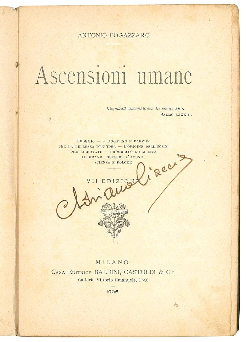 In 16mo (mm 190x125); pp. XXIV, 258, [4]. Occhietto. Alcune carte un po' fiorite. Contiene: Proemio, S. Agostino e Darwin , Per la bellezza di un'idea, L'origine dell'uomo, Pro libertate, Progresso e felicità, Le grand poète de l'avenir, Scienza e dolore. Brossura editoriale originale. Copertine un po' sporche. Note di possesso manoscritte al margine superiore della copertina anteriore e al frontespizio. Alcuni fascicoli po' sciolti, ma nel complesso ottimo esemplare.