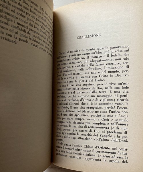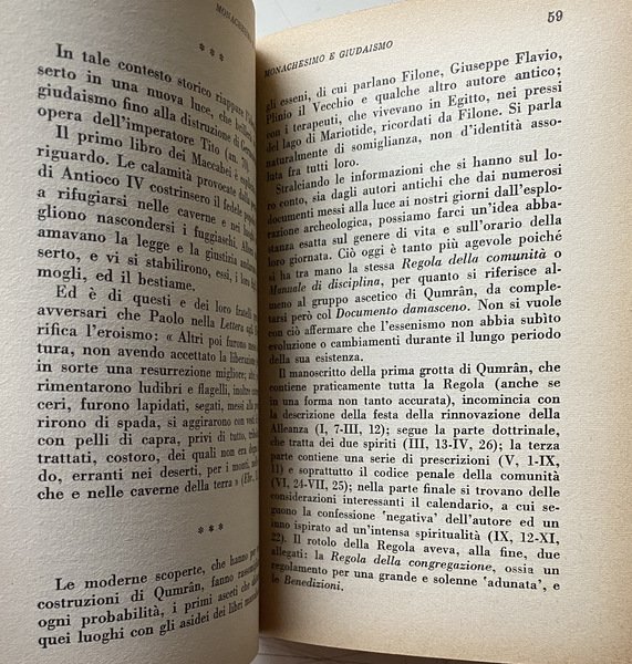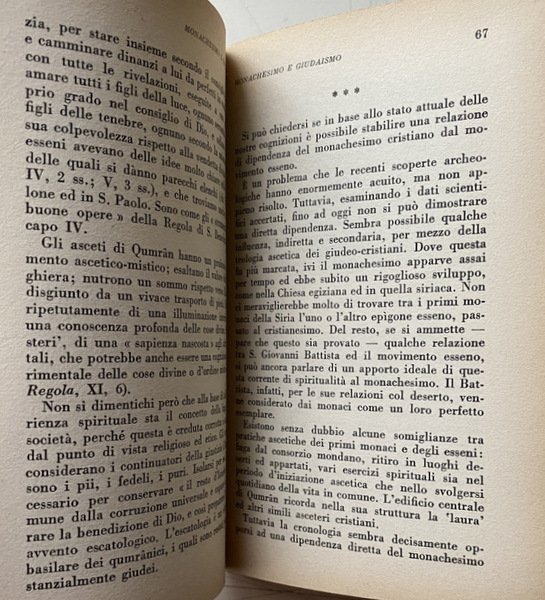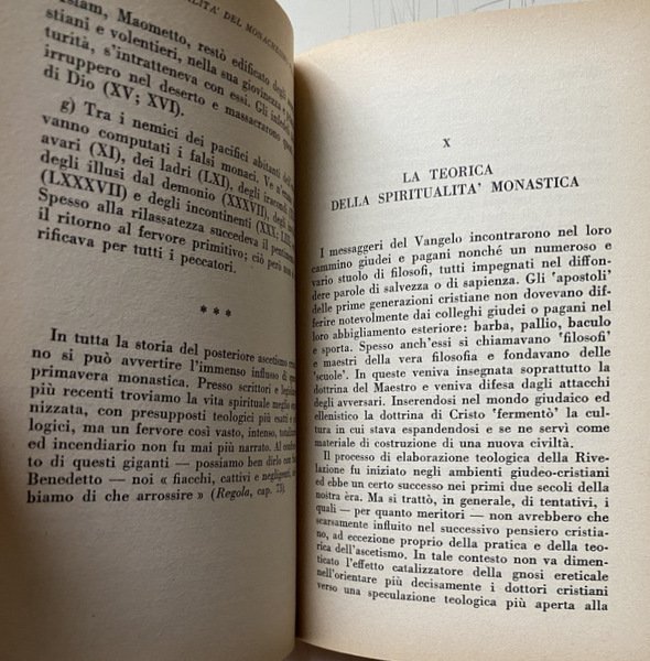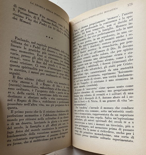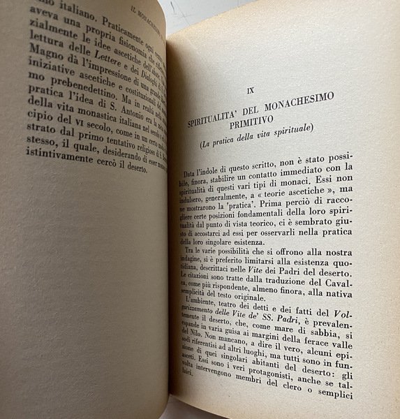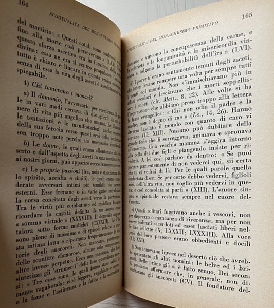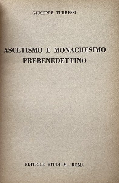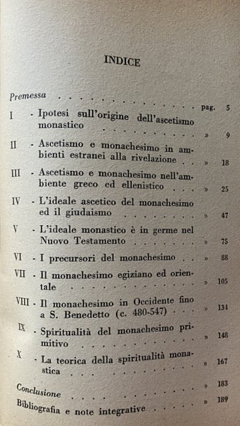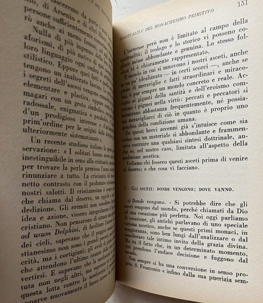 Soggetti: Storia medievale, Medievistica, Cristianesimo, Medioevo, Cultura medioevale, Monachesimo primitivo, Religione, Teologia, Storia religiosa, Ordini monastici, Monaci, Studi culturali, Monasteri, Abbazie, Spiritualità, Istituzioni e organizzazioni cristiane, Chiesa, Comunità femminili, Preghiera, Lavoro, Regola, Vita monastica, Ascetica, Ascetismo, Misticismo, Mistica, Ascesi, Digiuno, Benedetto da Norcia, Regole monastiche antiche, Rivelazione, Ideale monastico, Antico Testamento, Egitto, Medio Oriente, Precursori, Origini, Occidente, Teorica, Bibliografia, Riferimento, Libri Vintage fuori catalogo, Saggistica, Collezionismo, Sant'Agostino, S. Atanasio, Vita di Antonio, Donne, S. Cipriano, Tertulliano, Testimonianze, Africa, Ponto, Cappadocia, Cenobitismo, Eremiti, Eremitaggio, Gesù, Imitazione, Solitudine, Distacco, Iter spirituale, Penitenza, Perdono, Martirio, Passioni, Peccati, Ebraismo, Giudaismo, Palestina, Sinai, Martyrion, Pellegrinaggio, Pellegrini, Rituali, Mosè, Elia, Tabernacolo, Bibbia, Pasqua, Ortodossia, Verginità, Filone, Jahvè, Qumran, S. Paolo, Benedizione, Partecipazione, Incarnazione, Giovanni Battista, Esseni, Esercizi spirituali, Iniziazione, Giuseppe Flavio, Igiene, Bagno, Purificazione, Piccozzino, Prova, Celibato, Castità, Giuramento, Infrazioni, Documento damasceno, Fuga, Fuggiaschi, Disciplina, Congregazioni, Calendario, Prescrizioni, Ozio, Povertà, Terra, Umiltà, Obbedienza, Virtù Demonio, Tentazioni, Frontonio, Vite dei Padri, Cavalca, Anacoretica, S. Patrizio, S. Girolamo, Germano di Auxerre, Grecia, Gerico, Neoplatonismo, Ellenismo, Nomadismo, Stoicismo, Gerusalemme, Terra Santa, Beduini, Mar Saba, Anastasio, Asia Minore, Armenia, Siria, San Basilio, Mesopotamia, Antiochia, Priore, Abati, S. Pacomio, Ufficio divino, Nilo, Beni, Arsenio, Gallia, Europa, S. Martino, Tours, Ilario di Poitiers, Vita apostolica, Famiglia, Vocazione, Stenochoria, Origene, Evagrio, Gregorio Nisseno, Isacco di Ninive, Cassiano, Pseudo Dionigi Areopagita, Fame, Astinenza, Concupiscenza, Carne, Weingarten, Wilamowitz, Kenyon, Garitte, H. Kock, U. Berlière, L. Wieger, Alessandro Bausani, Puech, W. Jaeger, G. Faggin, A. Brémond, K. Rahner, G. Bardy, M. Viller, J. Daniélou, H. Leclerq, F. Cavallera, Medieval history, Medieval studies, Christianity, Middle Ages, Medieval culture, Primitive monasticism, Religion, Theology, Religious history, Monastic orders, Monks, Cultural studies, Monasteries, Abbeys, Spirituality, Christian institutions and organizations, Church, Women's communities, Prayer, Work, Rule, Monastic life, Asceticism, Asceticism, Mysticism, Asceticism, Fasting, Benedict of Nursia, Ancient monastic rules, Revelation, Monastic ideal, Old Testament, Egypt, Middle East, Precursors, Origins, West, Theory, Bibliography, Reference, Books out catalogue, Non-fiction, Collectables, St. Augustine, St. Athanasius, Life of Anthony, Women, St. Cyprian, Tertullian, Testimonies, Pontus, Cenobitism, Hermits, Hermitage, Jesus, Imitation, Solitude, Detachment, Penance, Forgiveness, Martyrdom, Passions, Sins, Judaism, Palestine, Pilgrimage, Pilgrims, Rituals, Moses, Elijah, Tabernacle, Bible, Easter, Orthodoxy, Virginity, Philo, St. Paul, Participation, Incarnation, John the Baptist, Essenes, Spiritual exercises, Initiation, Josephus, Hygiene, Bath, Purification, Pickaxe, Trial, Celibacy, Chastity, Oath, Infractions, Damascene document, Escape, Fugitives, Discipline, Congregations, Calendar, Prescriptions, Idleness, Poverty, Earth, Humility, Obedience, Virtue Demon, Temptations, Frontonius, Lives of the Fathers, Ride, Anchoritics, St. Patrick, St. Jerome, Germanus, Greece, Jericho, Neoplatonism, Hellenism, Nomadism, Stoicism, Jerusalem, Holy Land, Bedouins, Anastasius, Syria, Saint Basil, Mesopotamia, Antioch, Prior, Abbots, Saint Pachomius, Divine office, Nile, Beni, Gaul, Europe, Saint Martin, s. Hilary, Apostolic life, Family, Vocation, Origen, Evagrius, Gregory of Nyssenus, Isaac of Nineveh, Cassianus, Pseudo-Dionysius Areopagite, Hunger, Abstinence, Concupiscence, Flesh