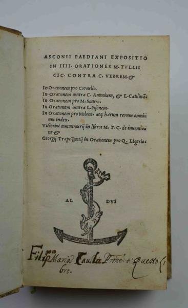 Cm. 15,8, cc. (12) 283 (1). Ancora aldina al frontespizio e al verso dell'ultima carta. Legatura settecentesca in mezza pergamena. Un'antica firma di possesso manoscritta alla base del frontespizio e varie note ms. coeve nel testo. una leggera gora alla parte bassa di poche carte, peraltro esemplare in ottimo stato di conservazione, particolarmente marginoso. Ex libris nobiliare inciso del prof. O. Penzig. Prima edizione aldina per questa interessante raccolta di scritti in forma di commentario ad opere ciceroniane sull'organizzazione ed il funzionamento delle assemblee e delle magistrature nella Roma antica. Cfr. Renouard 96.8 e Adams A-2054.
