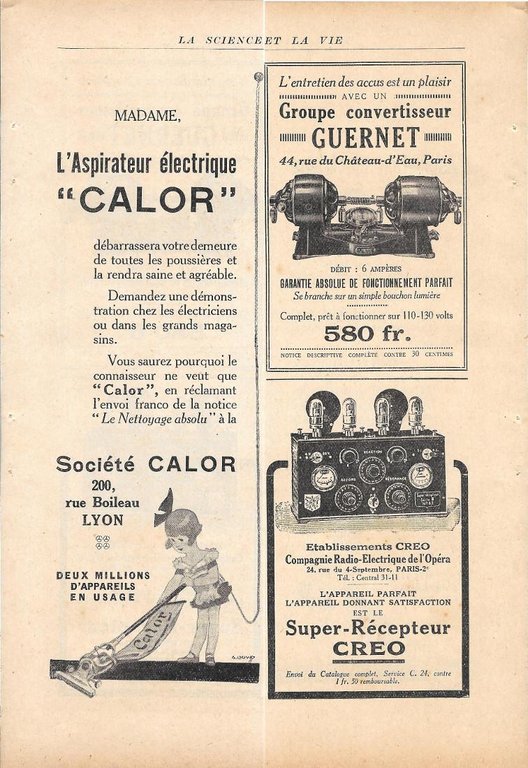 Aspirateur Calor / Groupe convertisseur Guernet / Recepteur Creo. Pubblicita 1926