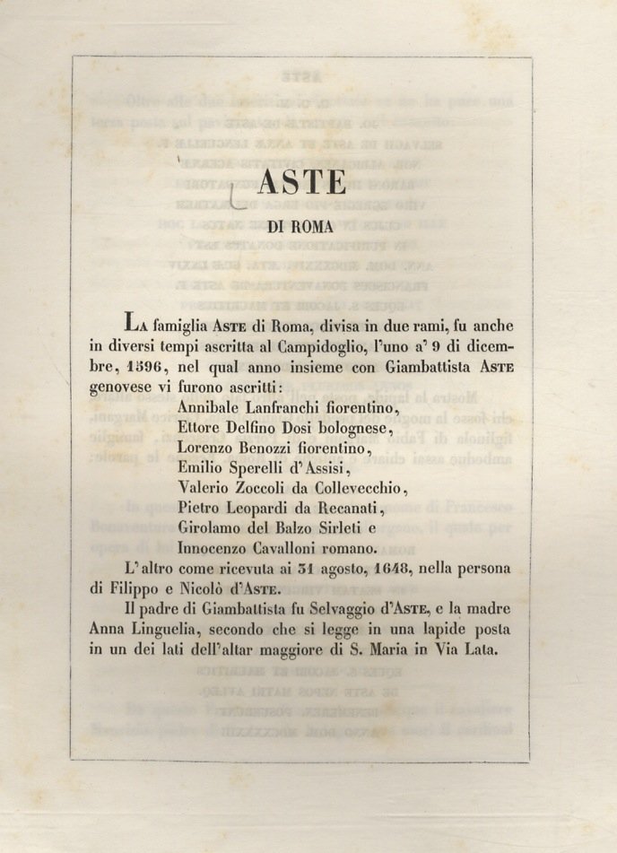 Lodi, Wilmant e figli, 1841-1848, in-4, privo di brossura, pp. [8]. Con uno stemma accuratamente miniato a mano all'epoca, in vividi colori, con particolari dorati, su una tavola f.t. Fascicolo a fogli sciolti, dedicato alla storia della famiglia, tratto da "Teatro araldico, ovvero Raccolta generale delle armi ed insegne gentilizie delle più illustri e nobili casate che esisterono un tempo e che tuttora fioriscono in tutta Italia" di Leone Tettoni e F. Saladini, Lodi, Wilmant e figli, 1841-1848. Buone condizioni.