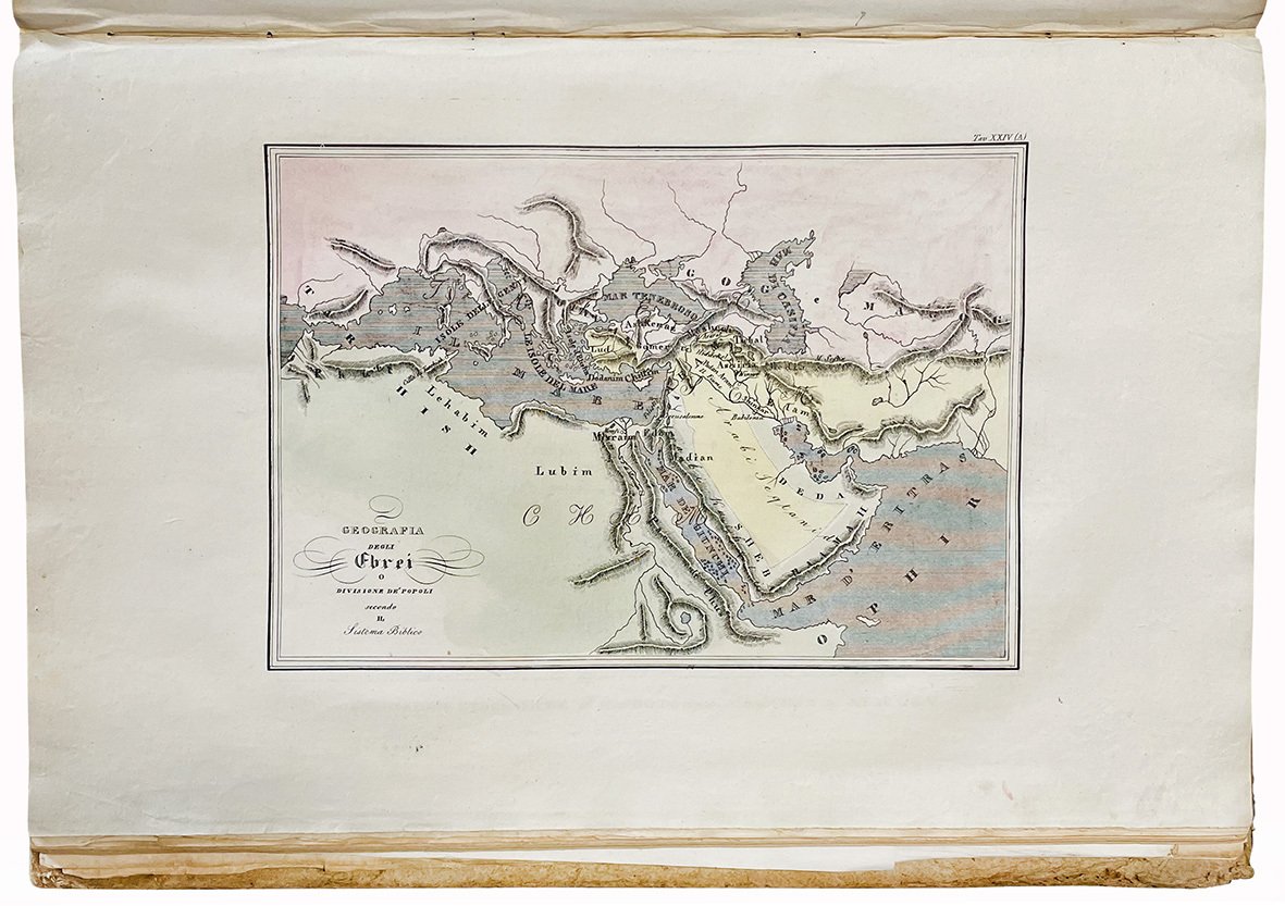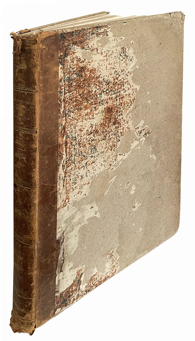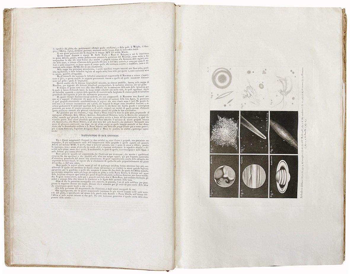 In folio (mm 435x278); pp. [8], 19, [17], [36], [10], [36], [4]; [68] cc. di tav. incise su rame, molte doppie e più volte ripiegate, alcune della quali colorate. Le carte geografiche sono numerate in cifre romane (I-LVIII) ed alcuni numeri sono ripetuti: XVIII (A/B); XXI (A/B/C); XXII (A/B/C); XXIV (A/B); XXXVI; XXXVI (A/B/C); LVI; LVI bis. Staccata la tav. XXXIV. Lievissime fioriture marginali. Mezza pelle coeva con fregi, filetti e titolo in oro al dorso. Piatti rivestiti con carta marmorizzata. Pesanti mancanze ai piatti, lievi abrasioni al dorso e piccole mancanze alle cuffie.