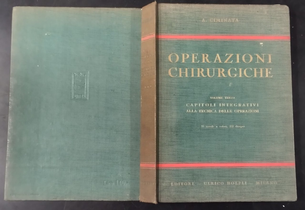OPERAZIONI CHIRURGICHE di A. Ciminata Solo il volume 3: Capitoli integrativi alla tecnica delle operazioni. Hoepli Editore, 1939 . XI, 352 pagine, 322 disegni in bianco e nero nel testo e 18 tavole a colori fuori testo. Copertina editoriale in tutta tela. Stato di conservazione: molto buono (pagine normalmente ingiallite) Libro usato saggistica medicina chirurgia