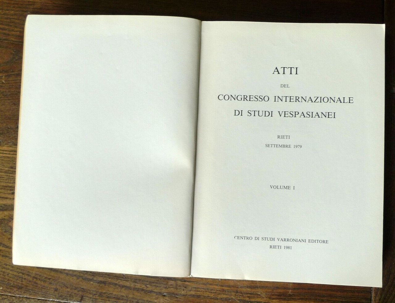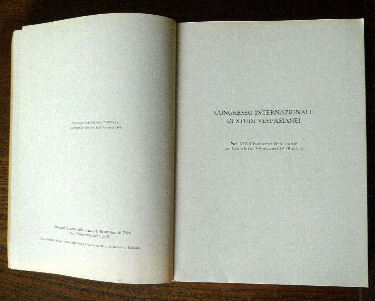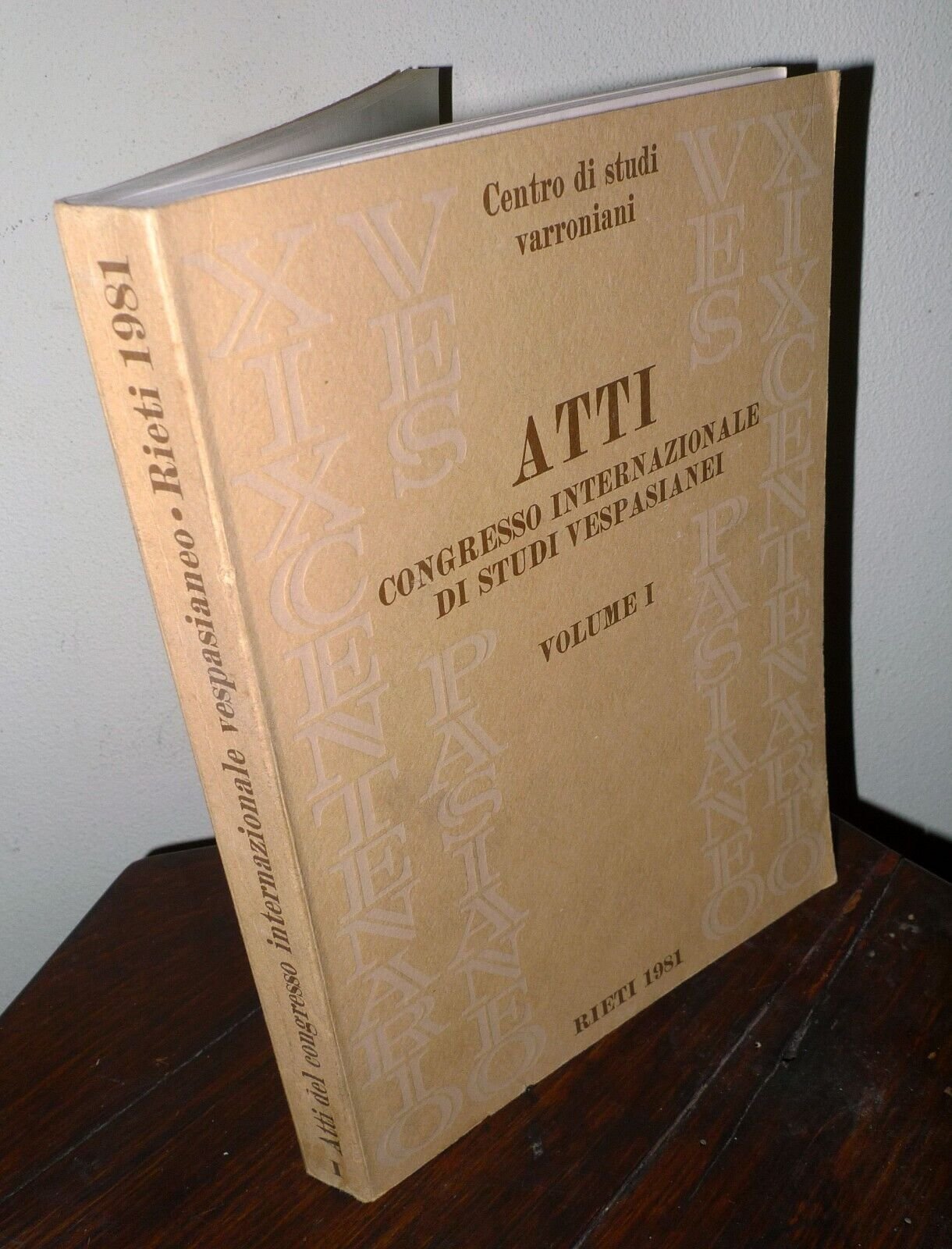 A cura del Prof.Benedetto Riposati,ATTI DEL CONGRESSO INTERNAZIONALEDI STUDI VESPASIANEI.RIETI SETTEMBRE 1979.Nel XIX Centenario della morte diTito Flavio Vespasiano (9-79 d.C.)VOLUME I.Centro di Studi Varroniani Editore, Rieti 1981,brossura, 24x17 cm., pp.294,peso: g.700