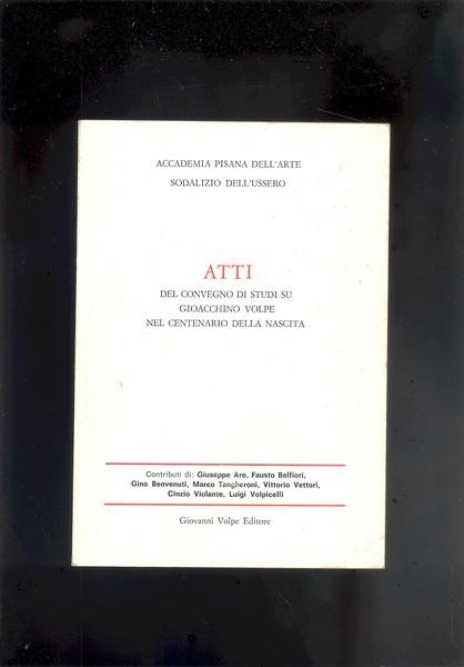 IN 8, pp.126, INDICE. COPERTINA EDITORIALE PATINATA CON TITOLO. DOPO UN LUNGO PERIODO DI SILENZIO, L'INTERESSE DEGLI STUDIOSI TORNA A VOLGERSI VERSO L'OPERA DI VOLPE, AL SUO REALISMO STORICO, ALLA SUA STORIA INTESSUTA CON TUTTI GLI ELEMENTI DA CUI GLI UOMINI SONO MOSSI A FARE LA STORIA. CONTRIBUTI DI : G.ARE, F.BELFIORI, G.BENVENUTI, M.TANGHERONI, V.VETTORI, C.VIOLANTE, L.VOLPICELLI. SONO GLI ATTI DEL CONVEGNO ORGANIZZATO DALL'ACCADEMIA PISANA DELL'ARTE SODALIZIO DELL'USSERO<BR>NEL 1976. INTRODUZIONE DI VITTORIO VETTORI. FU ALLIEVO DI AMEDEO CRIVELLUCCI ALLA SCUOLA NORMALE DI PISA, ACCADEMICO D'ITALIA E SOCIO DELL'ACCADEMIA DEI LINCEI. OTTIMA CONSERVAZIONE. ID 4260