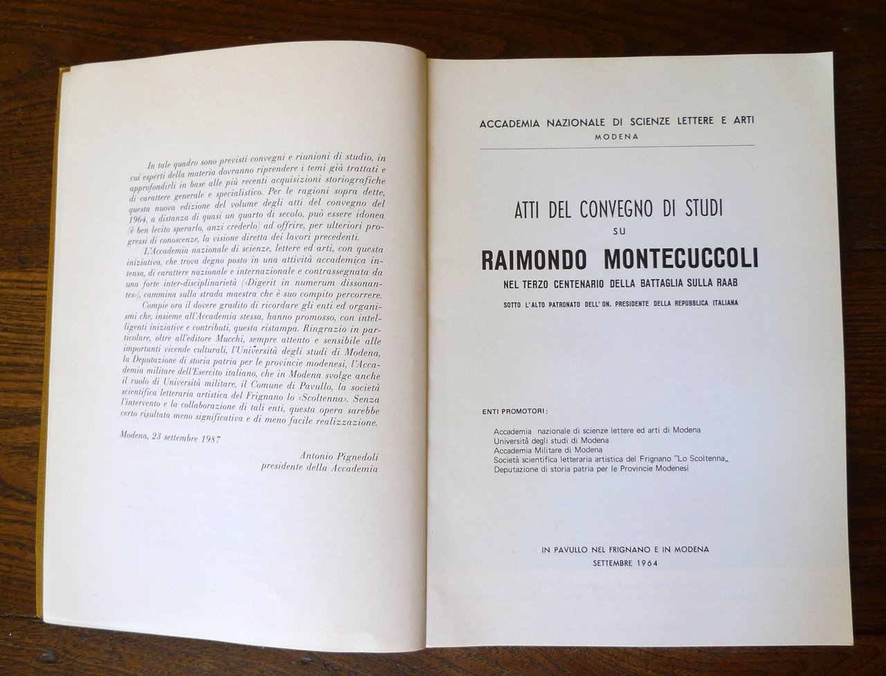 ACCADEMIA NAZIONALE DI SCIENZE LETTERE E ARTIMODENAATTI DEL CONVEGNO DI STUDI SU RAIMONDO MONTECUCCOLInel terzo centenario della battaglia sulla Raabsotto l'Alto Patronato dell'On. Presidente dellaRepubblica Italiana.In Pavullo nel Frignano e in Modena.Mucchi Editore, Modena,RISTAMPA ANASTATICA 1987 dell'edizione originale del 1964,brossura, 24x17 cm., pp.291,alcune illustrazioni in bianco e nero,alcuni testi in italiano, altri in tedesco,peso: g.700cod.9566CONDIZIONI DEL LIRBO: ottime,pagine leggermente ingiallite