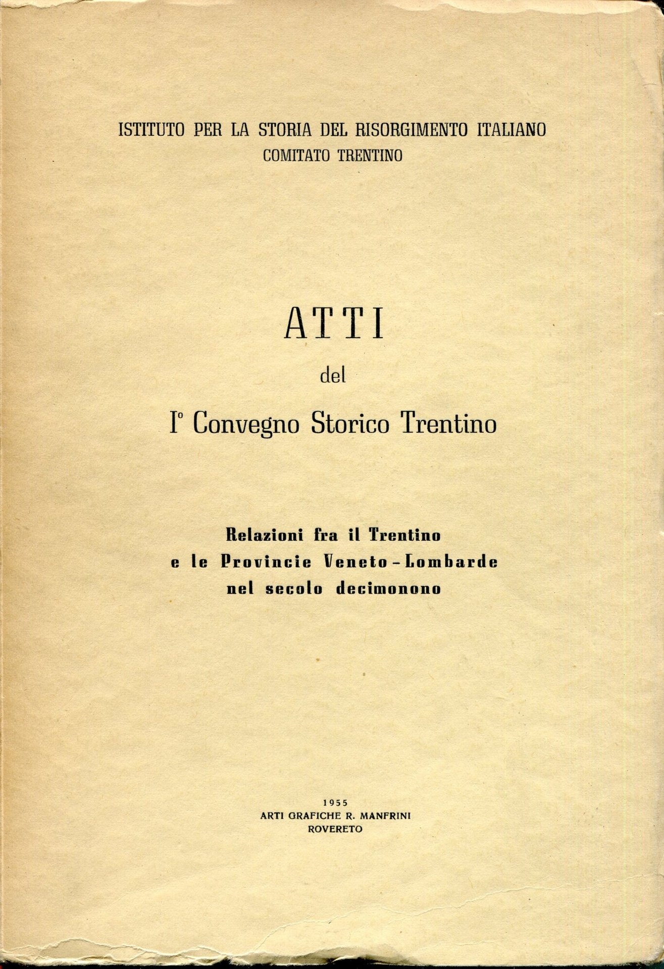 Atti del I Convegno storico trentino : Relazioni fra il Trentino e le provincie veneto-lombarde nel secolo decimonono