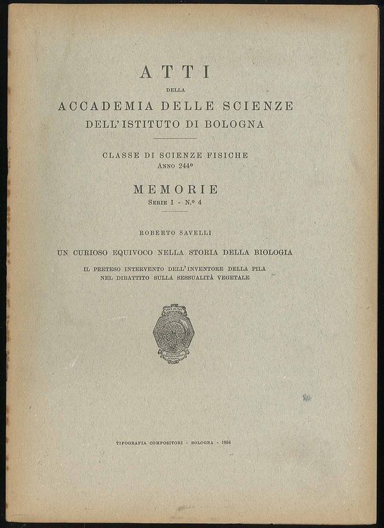 Un curioso equivoco nella storia della biologia, il presteso intervento dell'inventore della pila nel dibattito sulla sessualità vegetale. Opuscolo, ingiallito, intonso con macchie al margine sx della copertina