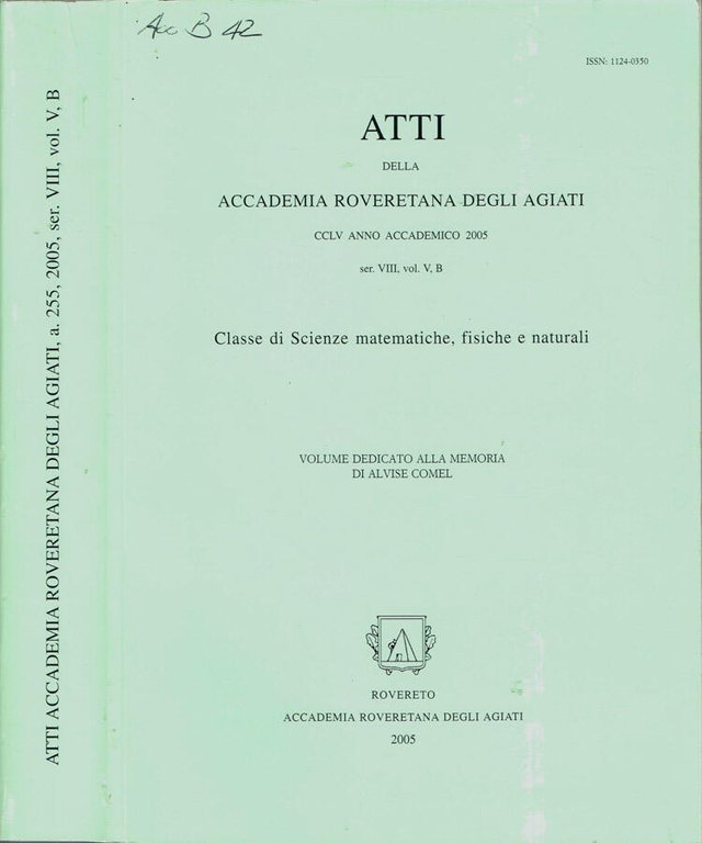 CCLV Anno Accademico 2005, Vol. V, B, Serie VIII della collana Atti della Accademia Roveretana degli Agiati - Classe di Scienze Matematiche, Fisiche e Naturali, direttore: Dr. Antonio Galvagni. Volume dedicato alla memoria di Alvise Comel. Pubblicazione realizzata con il contributo della Provincia Autonoma di Trento e con il patrocinio di: Comune di Rovereto, Fondazione Cassa di Risparmio di Trento e Rovereto. Buono stato, coperta in cartoncino patinato, su piatto anteriore catalogazione bibliotecaria manoscritta, bordo leggermente sfregato, macchiette su tagli concavo e di piede, quello di testa poco ambrato, cerniera stretta, pagine in ottimo stato. Presenta timbro ex biblioteca su frontespizio e su excipit, illustrazioni in b. e n. ed a colori. Lingue: Italiano, Inglese. Numero Pagine 528