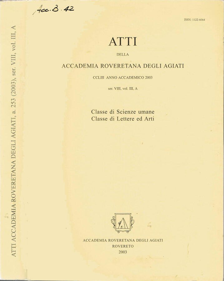 CCLIII Anno Accademico 2003, Vol. III, A, Serie VIII della collana Atti della Accademia Roveretana degli Agiati - Classe di Scienze Umane - Classe di Lettere ed Arti, direttore: Dr. Ing. Adriano Rigotti. Pubblicazione realizzata con il sostegno dei Soci Sostenitori e della Provincia Autonoma di Trento e con il patrocinio di: Comune di Rovereto, Fondazione Cassa di Risparmio di Trento e Rovereto. Buono stato, coperta in cartoncino patinato, su piatto anteriore catalogazione bibliotecaria manoscritta, bordo poco sfregato, lieve ammaccatura, graffi, cerniera stretta, pagine in ottimo stato. Presenta cifra manoscritta e timbro ex biblioteca su frontespizio, timbro ex biblioteca sul margine di piede di qualche pagina, marginalia, illustrazioni in b. e n. Numero Pagine 397
