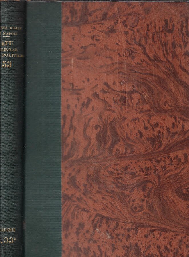 Volume 53° degli "Atti della Reale Accademia di scienze morali e politiche della Società Reale di Napoli. Il volume potrebbe contenere timbri ed etichette dell'Istituto Veneto, regolarmente acquisito dalla nostra libreria. Coperta rigida in mezza tela lievemente ingiallita dal tempo presentante segni di usura da scaffale ai margini e da sfregamento ai piatti. Pagine fruibili anche se leggermente ingiallite dal tempo in particolare ai tagli; piccolo segno a biro al frontespizio. Numero pagine 361.