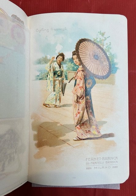 In-8°, pp. 176, interamente illustrato in cromolitografia, brossura editoriale. Mancanza di circa 2 cm alla parte superiore del dorso. Nel complesso ottimo esemplare. Interessante e piacevole pubblicazione pubblicitaria che illustra i costumi di moltissimi popoli in tutti e 5 i continenti. Di ogni nazione si illustra in elegante cornice editoriale in stile liberty una carta geografica , la bandiera, lo stemma e una veduta della capitale. Nella pagina accanto una bella illustrazione cromolitografica raffigurante il costume popolare nel proprio habitat.