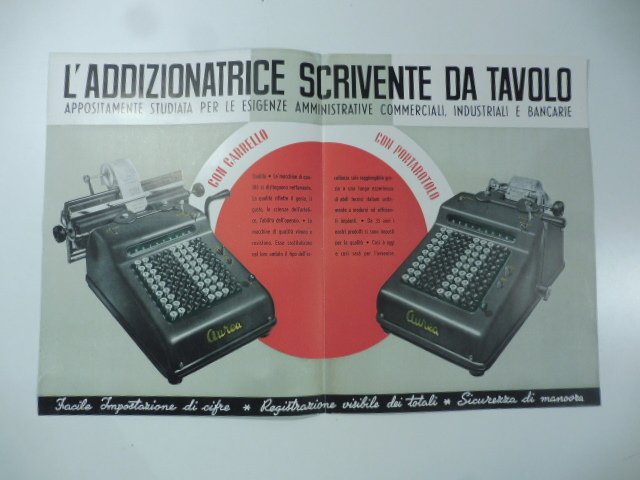 Bifolio pubblicitario, cm 21 x 27,5, che presenta due modelli di questa macchina calcolatrice italiana, con carrello e con portarotolo. Bella grafica modernista. '.la qualita' riflette il genio, il gusto, la scienza dell'artefice, l'abilita' dell'operaio.'