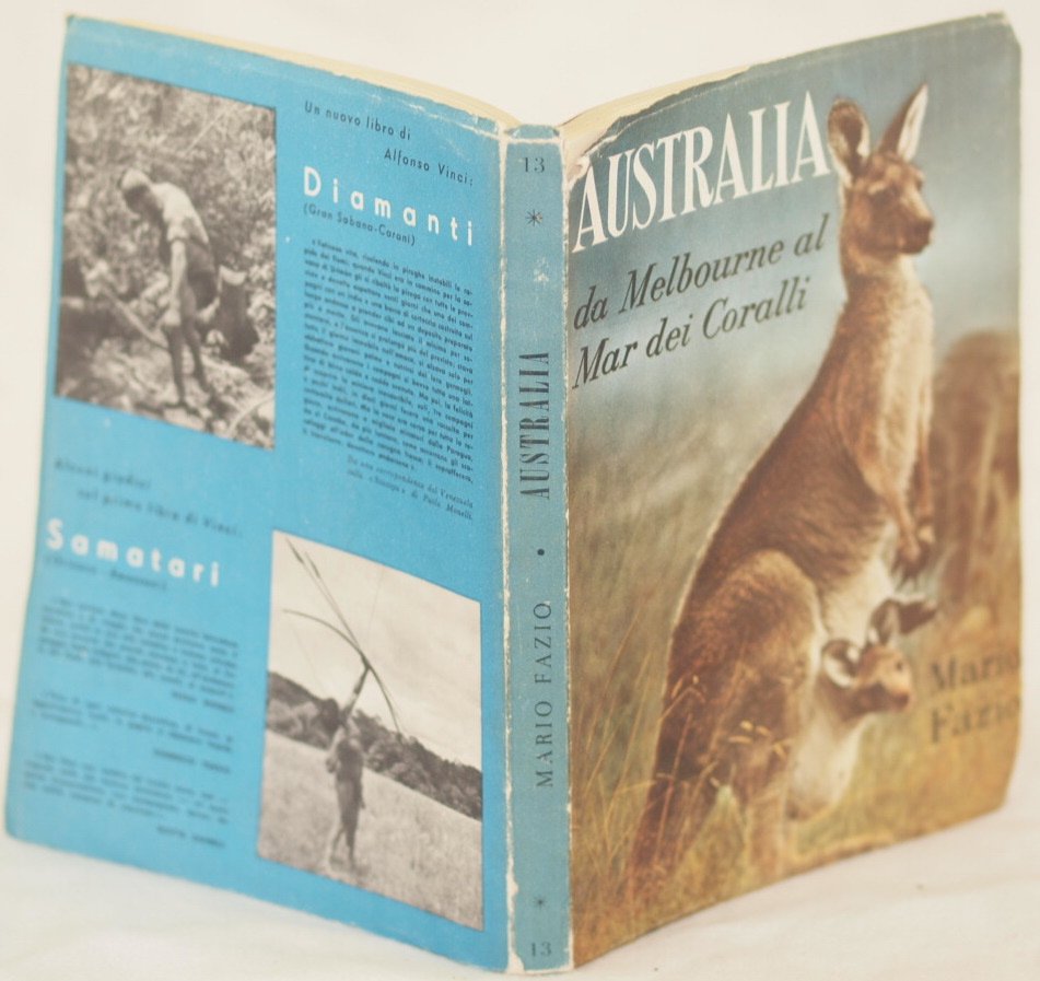 In 8. cm 22,5x16,5. Pp. 217+(3). Prima edizione del 1956 di questo libro sull'Australia di Mario Fazio.<BR>Mappa in antiporta e numerose planches fotografiche che mostrano vedute di Melbourne, Sydney, Canberra, Queensland ecc. In buone condizioni. Copertina editoriale in buone condizioni generali con lievi usure ai margini. Legatura in buone condizioni. Pagine in buone condizioni con rare fioriture. First edition of 1956 of this book about Australia by Mario Fazio. Map in the frontspice and different photographic planches showing views of Melbourne, Sydney, Canberra, Queensland ecc.<BR>In good conditions. Editorial cover in good general conditions slightly worn in the edges and spine. Binding in good conditions. Pages in good conditions with occasional foxings.