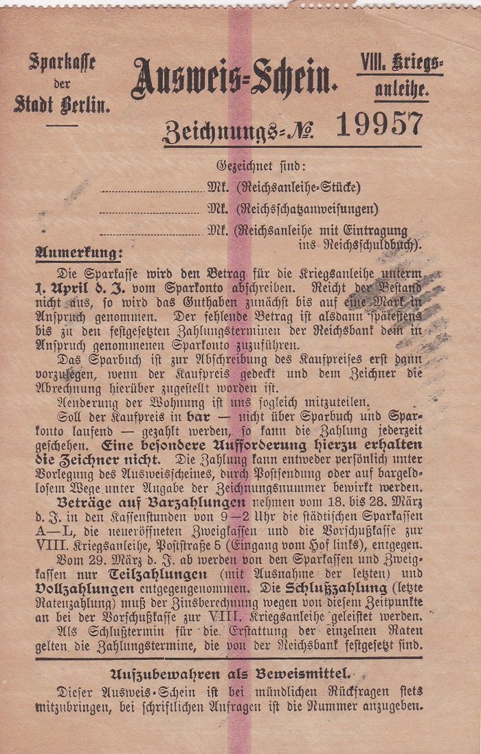 Der Ausweis-Schein für die Anleihe wurde nicht ausgefüllt. Es handelt sich hier um die achte Kriegsanleihe des Deutschen Reichs im Ersten Weltkrieg. Insgesamt wurden bis Kriegsende neun Anleihen zur Finanzierung des Kriegs ausgegeben. Seltene Archivalie zur deutschen Geschichte im 20. Jahrhundert!