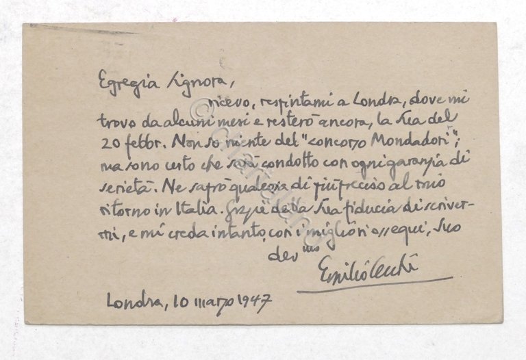 Cartolina autografa del critico letterario Emilio Cecchi - datata Londra 10 Marzo 1947 Dimensioni: 9 x 14 cm ca. Condizioni molto buone. Emilio Cecchi (Firenze, 14 luglio 1884 – Roma, 5 settembre 1966) è stato un critico letterario e critico d'arte italiano. È considerato una delle figure di maggior rilievo del giornalismo culturale italiano della prima metà del Novecento.