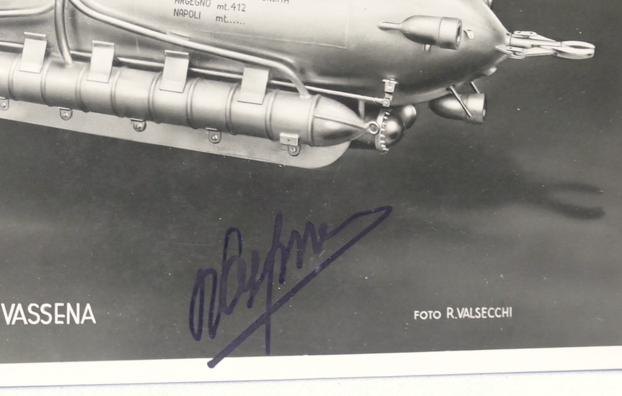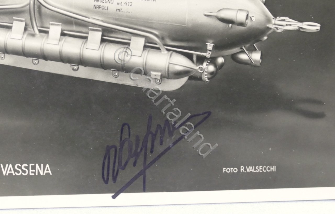 Autografo dell'inventore Pietro Vassena su cartolina raffigurante la sua creazione: il Sommergibile C3 - 1948 ca. Dimensioni: 10 x 15 cm. Condizioni molto buone. Pietro Vassena (Malgrate, 21 aprile 1897 – 21 maggio 1967) è stato un inventore e imprenditore italiano. Inventore autodidatta con una grande passione per l'acqua, divenne celebre per aver immaginato e realizzato il C3 (batiscafo) col quale stabilì, il 12 marzo 1948 ad Argegno (Como), il record mondiale di immersione, raggiungendo la profondità di -412 metri.