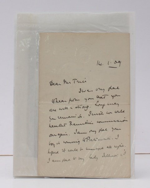 4pp notelet (two pages blank), measuring 7.0 x 4.5 ins (approx. 18.0 x 11.5 cms), on blind-embossed Admiralty stationery, dated 14 January 1909, last (blank) page lightly dusty else a near fine copy. THE ENTIRE LETTER IS WRITTEN, DATED AND SIGNED IN JELLICOE'S HAND. Jellicoe writes to one 'Mr. Trill', evidently an old shipmate from HMS Ramillies. 'I was very glad to hear from you that you are well and strong. Long may you remain so. I wish we could have the Ramillies commission over again. I am very glad that your boy is coming to Portsmouth. I hope it will be managed all right. I am glad to say that Lady Jellicoe and I are both very well. I hope some day at Portsmouth we may come across you, but I am much tied to the office here. I would sooner be fitting out nets at sea'. John Rushworth Jellicoe, Admiral of the Fleet Earl Jellicoe (1859-1935) commanded the Grand Fleet at Jutland. He was appointed to HMS Ramillies, new flagship of the Mediterranean Fleet, which he commanded from 1893-7 (probably the period referred to in the letter). He later served as First Sea Lord and was raised to the peerage in 1925 as 1st Earl Jellicoe. AUTOGRAPH MATERIAL BY JELLICOE IS EXTREMELY SCARCE.