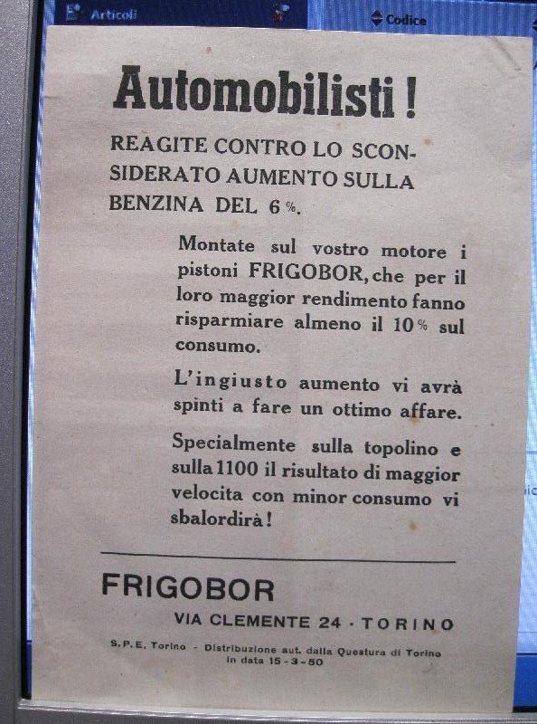 Foglietto cm 12,5 x 17,5. Foglietto pubblicitario dei pistoni Frigobor che fa leva sull'aumento del 6% del prezzo della benzina e della possibilita' di risparmiare il 10% sul consumo montando i pistoni Frigobor.