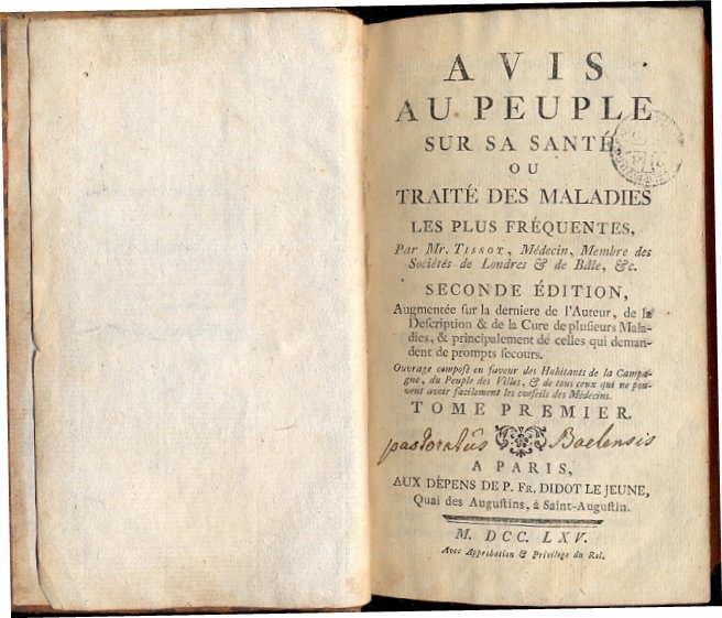 Avis au peuple sur sa santè, ou traitè des maladies les plus fréquentes. Seconde edition, augmentée sur la derniere de l'Auteur, de la description & de la Cure de plusieurs Maladies, & principalement de celles qui demandent de prompts secours. Ouvrage composè en faveur des habitants de la campagne, du Peuple des villes, & de tous ceux qui ne pauvent avoir facilement les conseils des Mèdecins.