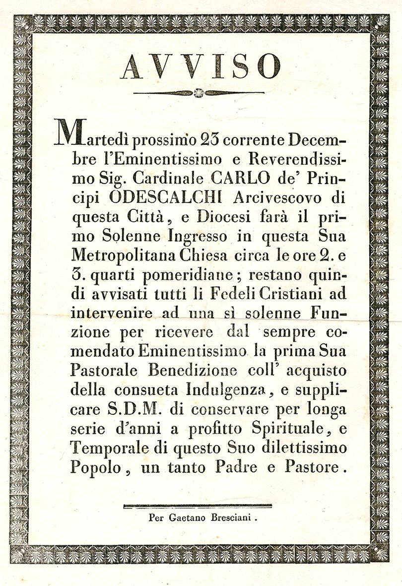 Avviso ai fedeli: martedì 23 Dicembre (1823) il Card. Carlo dei Principi Odescalchi farà il primo solenne ingresso nella sua Chiesa Metropolitana alle ore 2:45 come Vescovo di Ferrara