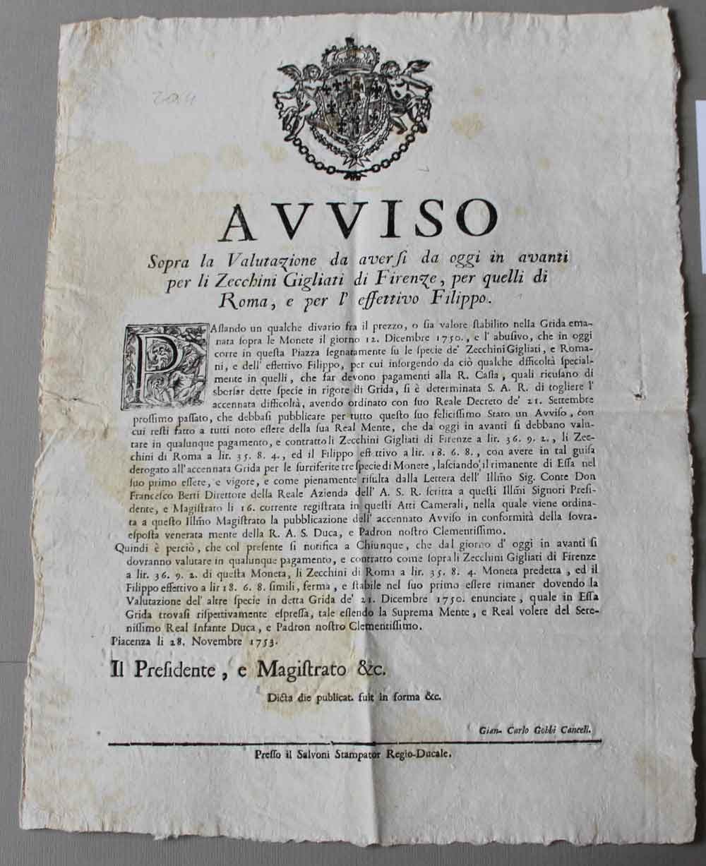 Avviso sopra la valutazione da aversi da oggi in avanti per li Zecchini Gigliati di Firenze, per quelli di Roma e per l'effettivo Filippo