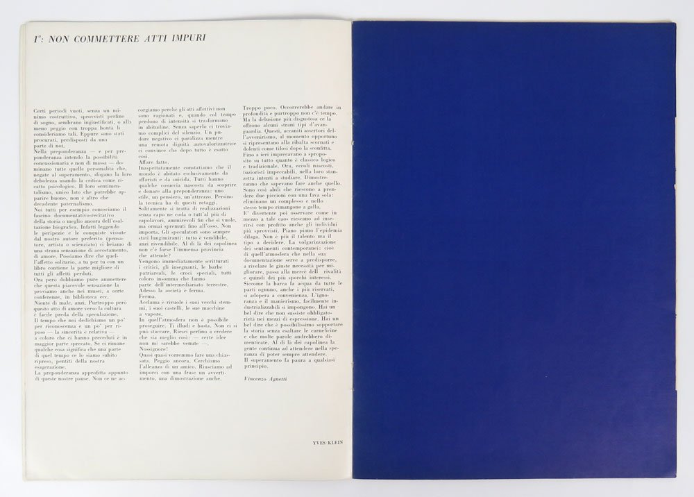 PERIODICOCollezione completa.Mimini segni d’usura perimetrali, con un leggerissimo accenno di piega verticale al piatto anteriore, visibile solo verso e che non intacca la grafica; uno dei bifoli centrali leggermente allentato; nel complesso in ottime condizioni. «Azimuth 2» con lieve brunitura marginale e ingiallitura verso della copertina; interni leggermente bruniti, come normale; complessivamente in ottime condizioni.Raro insieme completo dei due volumi della più importante rivista italiana d’arte contemporanea dei primi anni sessanta. In una lettera all’amico Valentino Dori (alias Giorgio Carmenati Francia), databile ai primi del 1959, Piero Manzoni annuncia la separazione dal Movimento nucleare: «Oggi ahimè il movimento si è scisso in due: io ora sono con Castellani e Bonalumi e perseguiamo quella linea che tu mi hai visto iniziare: usciremo prestissimo con una rivista nostra, di parte, che si chiamerà Pragma, e abbiamo al solito un programma quanto mai vivace» (Battino & Palazzoli, n. 79). La rivista a cui si fa riferimento finirà per chiamarsi in altro modo, ma è qui l’origine del progetto Azimut/Azimuth (senza “h” la galleria, con “h” la rivista). Nel febbraio del 1959 il trio suddetto espone alla Galleria del Prisma di Milano, una mostra poi portata alla Galleria Appia antica di Roma, in aprile, con presentazione di Leo Paolazzi (sarà Antonio Porta), e a settembre a Losanna, Galerie Kasper. Nello stesso aprile Manzoni apre una personale all’Aja (Relief schilderijen) e scrive ancora a Dori: «Sto preparando in questi giorni una nuova rivista d’arte, molto battagliera […] sembra che venga molto bene. […] Il nostro gruppo aumenta e la rivista servirà proprio a definirlo» (ivi, n. 103). In luglio è la volta dell’esordio del gruppo Zero al Rotterdam Kunstkring, istituzione fondata nel 1893 e da sempre attenta all’arte contemporanea (ospitò un’importante mostra futurista nel maggio del 1913 e già una personale di Manzoni nel settembre 1958): espone il gruppo Zero di Rotterdam più Manzoni. La stessa mostra approda alla fine di ottobre alla galleria Appia antica di Roma: il design dei cataloghi e del materiale promozionale relativo a questi due eventi mostra chiaramente l’origine grafica della copertina di Azimuth. -- «In the autumn of this year, Manzoni’s idea of opening and running a gallery materialises when he and Castellani rent and fit out a basement connected with a furniture shop in via Dei Bossi on the corner with via Clerici in Milan, which is later to become Galleria Azimut. […] In the same period, around October, while the first issue of the review “Azimuth” is going to press, Bonalumi, who has worked on it for a long time now, withdraws because of differences of opinion and disagreements about theoretical and ideological considerations. The first issue is edited by Castellani and Manzoni with the assistance of Marco Santini as editorial secretary and the graphic designer Cecco Re, who designed the cover and also suggested the title. The address of the review is via Cernaia 4 in Milan, Manzoni’s home address. “Azimuth” is printed in the workshop of Antonio Maschera, who previously printed “Direzioni N. 3” and — under the same imprint of the “E.P.I. editoriale periodici italiani” — the first issues of “Il Gesto”, the review of the Nuclear Group» (Battino & Palazzoli). -- Il primo numero di «Azimuth», chiamato semplice «Azimuth», contiene interventi militanti (Dorfles e Laszlo, ad aprire e chiudere il fascicolo), prose e poesie (Pagliarani, Agnetti, Paolazzi/Porta, Tullier, Balestrini, Picabia, Beckett), articoli di critica (Ballo, Alfieri, Y. Tono, Galvano); sei tavole a piena pagina (un «Meta-matic» di Tinguely, in foglio sciolto; un monocromo blu di Klein; un Dorfles; una scultura di Gio Pomodoro fotografata su fondo nero; una tavola di accertamento alfabetica di Manzoni; un Estienne in blu) e svariate opere riprodotte a tracciare i vasti confini della contemporaneità artistica eletta dalla rivista (Johns, Fontana, Rauschenberg, Megert, Angeli, Schwitters, Castellani, Rotella, A. Pomodoro, Bonalumi, Holweck, Mack, Fisicher, Kemeny, Piene, Wagemaker, Romyn, Manzoni, Schoonoven, Dahamen, Sanders, Bohemen, Schumaker, Tajiri, Pieters, Rossello, Dorazio, Dangelo, Marotta, Lora, Pena). Nelle pagine pubblicitarie finali, la costellazione di gallerie e riviste d’arte entro cui opera «Azimut/h» («Appia antica» di Villa, «Notizie» di Pistoi/Crispolti, «Direzioni» di Fabrizio Mondadori, «Le Arti» di Marussi/Vella e «Panderma» di Laszlo). -- Verso la fine dell’anno, Manzoni sta già lavorando ad «Azimuth 2», come apprendiamo da una lettera inviata a Heinz Mack del gruppo Zero di Dusseldorf: «Cher Mack, Piene t’a parlé de l’exposition qu’on va faire a Milan et du numéro de Azimuth, qu’on ira publier a l’occasion. […] Demain on ouvrira la Galerie Azimut: elle est à ta disposition, si tu veux l’y faire une exposition ou des manifestations» (Battino & Palazzoli n. 144). La mostra d’apertura della galleria Azimut è quella delle «12 linee» di Piero Manzoni, introdotte in catalogo da un testo di Vincenzo Agnetti, uno dei più stretti collaboratori di Manzoni e Castellani sul versante critico e letterario. «Galleria Azimut soon becomes a hotbed of encounter and debate in the artistic panorama of Milan thanks mainly to the contacts Piero Manzoni keeps up […]. A tireless organizer and promoter, he makes great efforts to discover, compare and publicise artists who are practically unknown in Italy and abroad at this time, himself included» (ivi, p. 59). Nel gennaio 1960 è la volta della fondamentale collettiva «La nuova concezione artistica», a cui è interamente consacrato il secondo e ultimo fascicolo della rivista. «Azimuth 2» è costruito attorno a un programma ben definito, proposto in italiano, inglese, francese e tedesco ed esplicitato nel lungo testo c