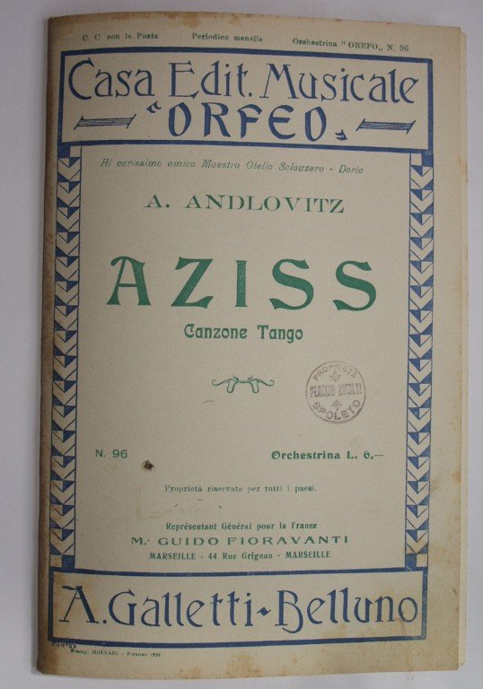 In 8. cm 27x17. Pp. 16. Partitura completa per orchestra del 1930. Caratteristica copertina decorata dell'epoca. Ex libris sulla copertina. Ottime le condizioni. A complete score for orchestra of 1930. Carachteristic decorated cover of that period. Ex libris in the cover. Very good general conditions.