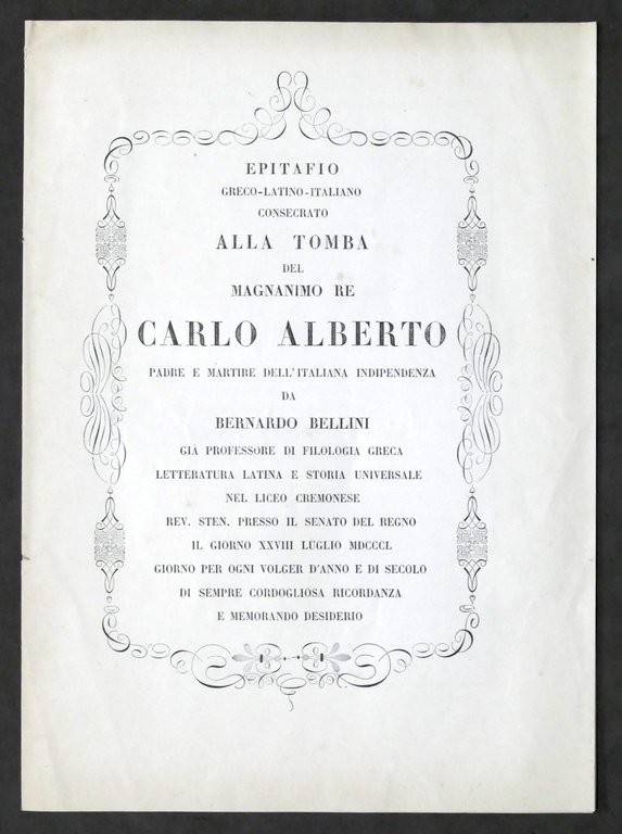 B. Bellini - Epitafio consecrato alla tomba del magnanimo Re Carlo Alberto 1850
