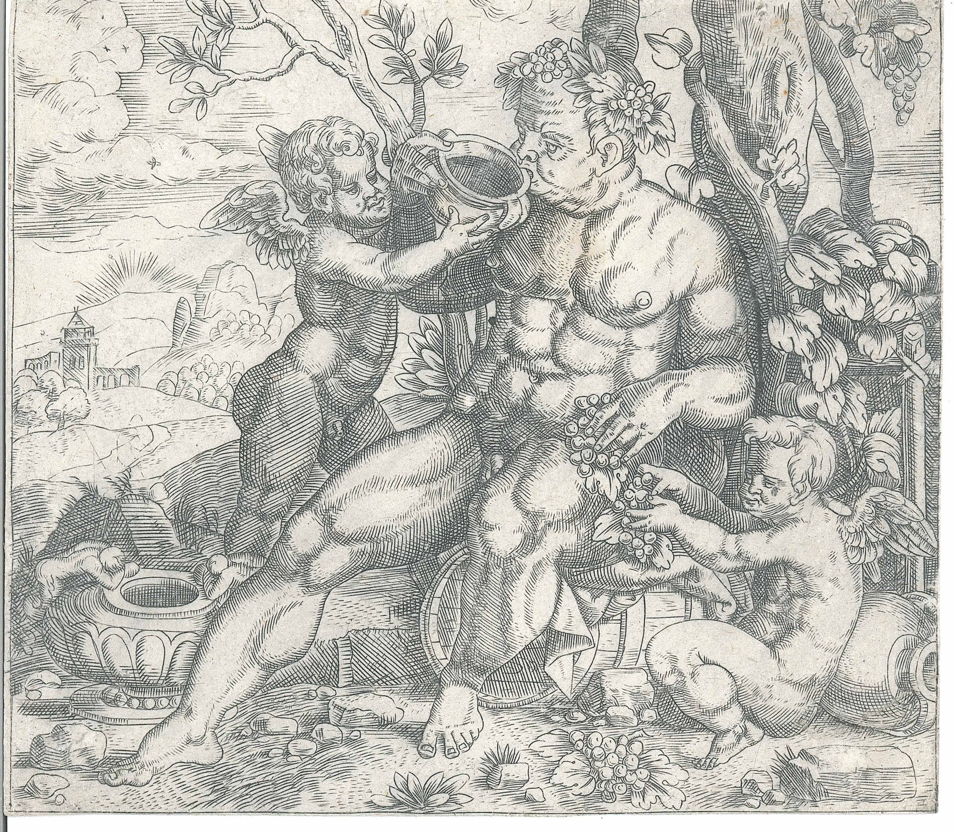 > Incisione originale a bulino, mm 135x155, stato unico. La prova, avente filigrana non identificata, è impressa su carta databile intorno alla metà del Cinquecento. Lo stile grafico si collega a quello della stampa raffigurante "Bellorefonte e Pegaso". La stampa raffigura Bacco seduto sopra una botte con la schiena appoggiata ad un albero. Intorno a lui, due amorini che gli porgono una coppa di vino e dell'uva. Al verso sono visibili in controluce antichi segni di colla.