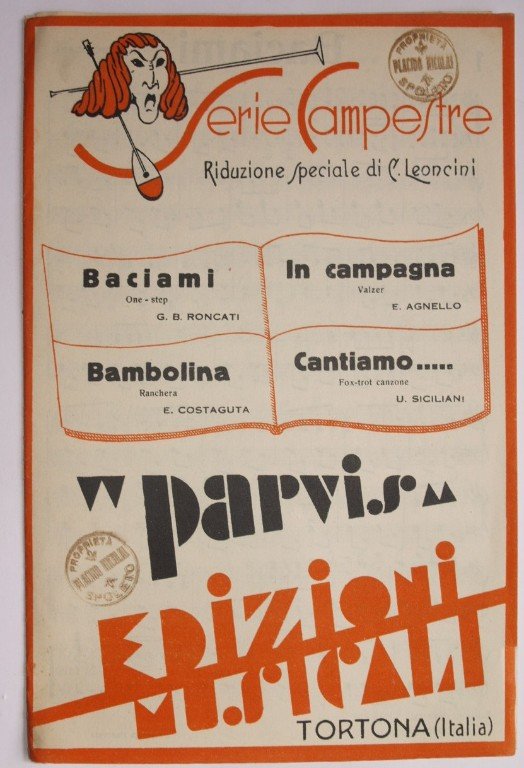 In 8. cm 26x17. Pp. 13. Partitura completa per orchestra del 1934 di quattro canzoni. Caratteristica copertina decorata dell'epoca. Ex libris sulla copertina e in qualche pagina. Ottime condizioni. A complete score for orchestra of 1934. Carachteristic decorated cover of that period. Ex libris in the cover and in some pages. Very good conditions.