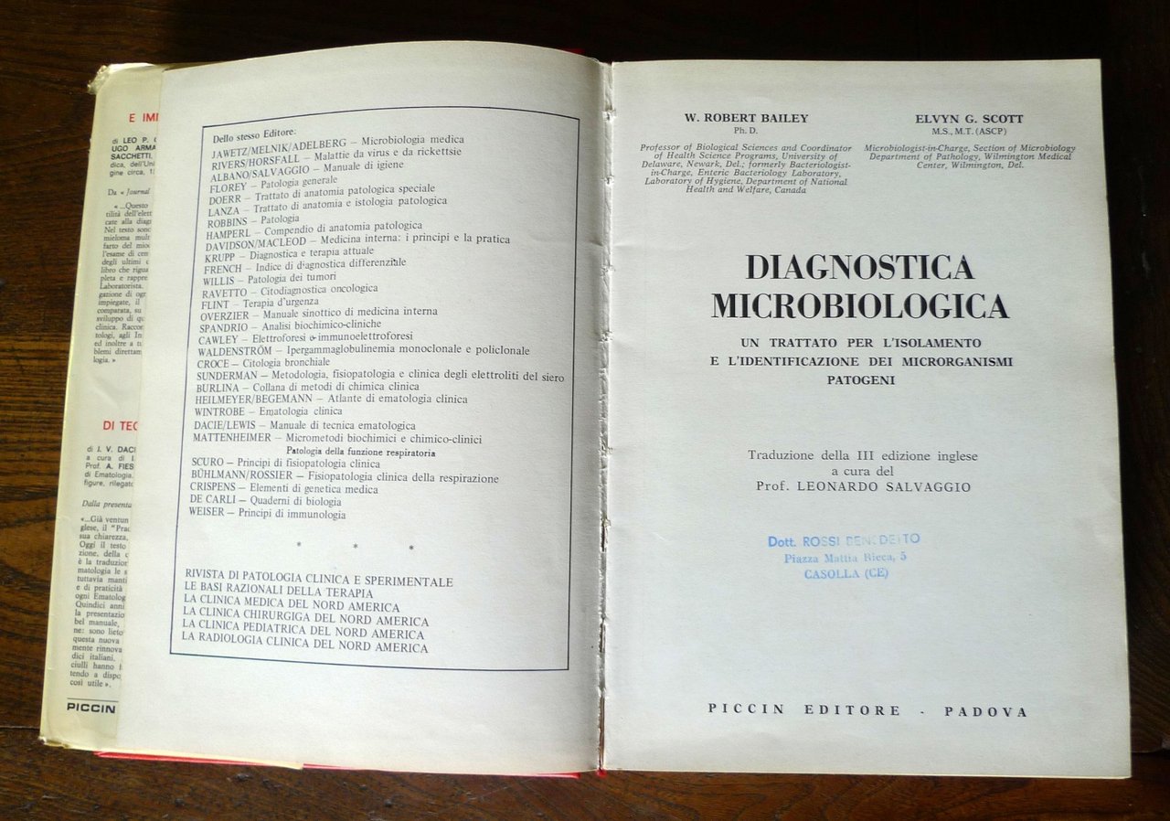 W. Robert Bailey - Elvyn G. Scott,DIAGNOSTICA MICROBIOLOGICA.Un trattato per l'isolamento e l'identificazionedei microrganismi patogeni.Traduzione della III edizione inglesea cura del Prof. Leonardo Salvaggio.Piccin Editore, Padova 1973,copertina rigida, rilegatura in similpelle,sovraccoperta, 25x18 cm., pp.VII-374,illustrazioni in bianco e nero,peso: kg.1,1cod.9537CONDIZIONI DEL LIBRO: buone,la sovraccoperta è usurataStrappi con mancanze),timbri di appartenenza alla prima pagina bianca,sottolineature e note a matita