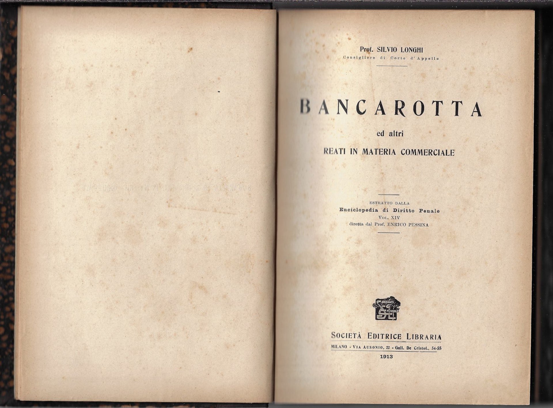 pp. XIII, 540; cm 26. Prima edizione Estratto dalla enciclopedia del diritto penale Vol. XIV, diretta dal Prof. Enrico Pessina Buono (Good) legatura muta con titolo oro al dorso, piccole abrasioni sui bordi, tagli bruniti, pagine in più che buono stato.