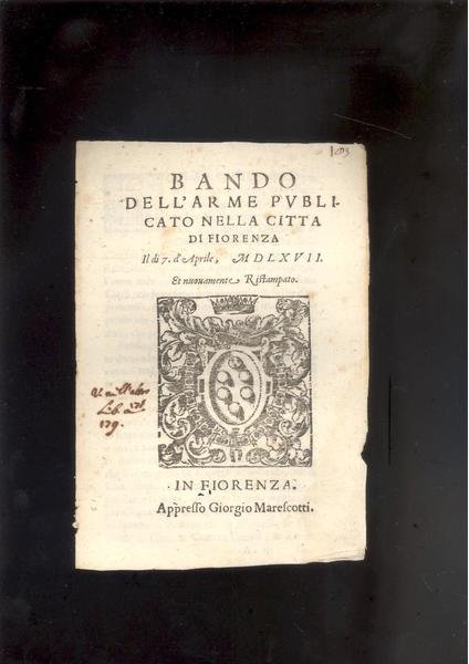 BANDO DELL'ARME PUBLICATO NELLA CITTA DI FIORENZA IL DI 7 D'APRILE, MDLXVII<BR>ET NUOVAMENTE RISTAMPATO